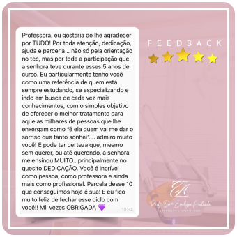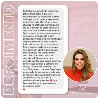 Assim que me formei em Odontologia, ingressei no mestrado de Patologia Bucal e Estomatologia e na sequencia no Doutorado em Clínicas Odontológicas. Além disso, possuo a especialidade de ortodontia, habilitação em laserterapia e ministro aulas na graduação e pós graduação há mais de 8 anos. Ter a oportunidade de ser professora e atender em consultório é uma união que agrega bastante na minha vivência clínica, sempre em busca de proporcionar o melhor atendimento.